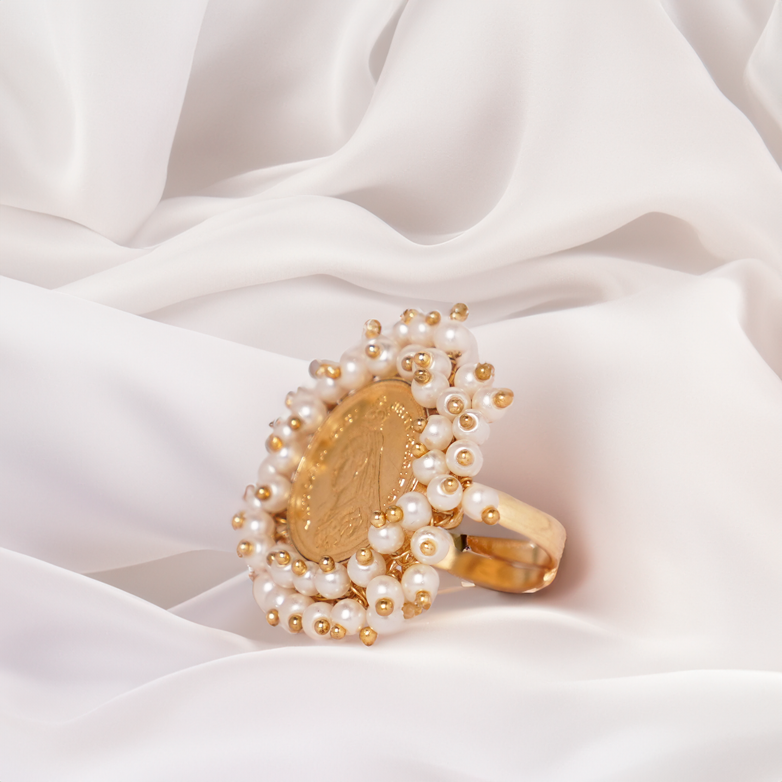 A regal blend of tradition and trend, this Coin Pearl Ring features a golden embossed centerpiece surrounded by dainty pearls. Waterproof, hypoallergenic, and made with high-polish stainless steel.